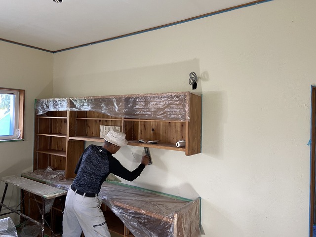 作り付けの食器棚以外の壁をコテで仕上げていきます。