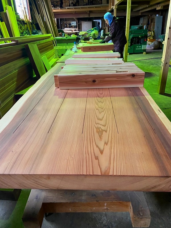 現在、無垢のスギの一枚板を加工してテーブルを製作している最中です。