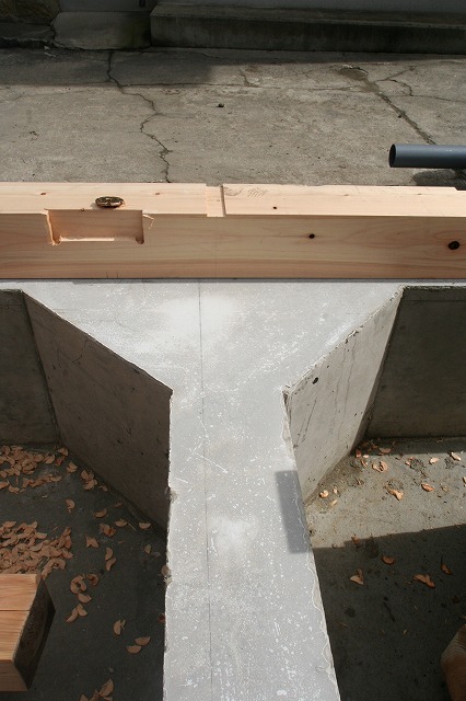 鉄筋配筋検査を終えコンクリートの打設、そして檜の土台入れしてます。