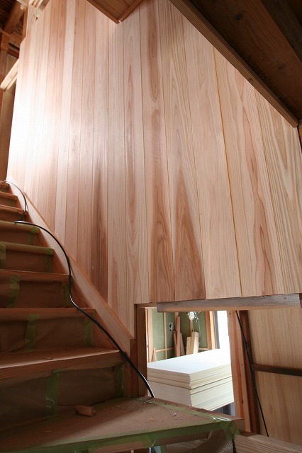 会津若松市のリフォーム現場では無垢の杉板を張っているところ。