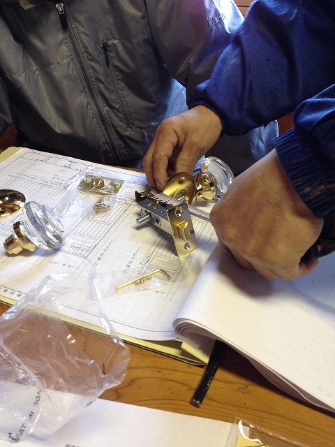 なにやらスケールでドアハンドルの寸法確認してます。