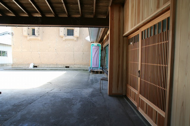 仮設WCが邪魔ですが玄関は味のある格子戸にしました。