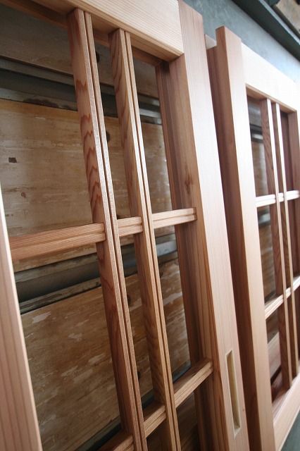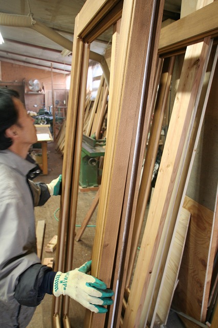 職人さんが手にしているのがヒバのサッシです。