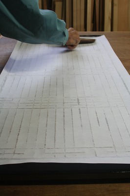 修理を終え今度は糊を付けて和紙を貼ります。