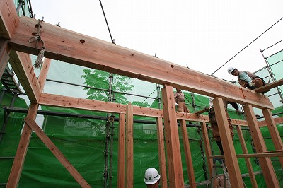 いつもなら梁や桁などの資材をレッカーで吊って上げて大工が組んでいくのですが。