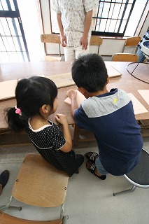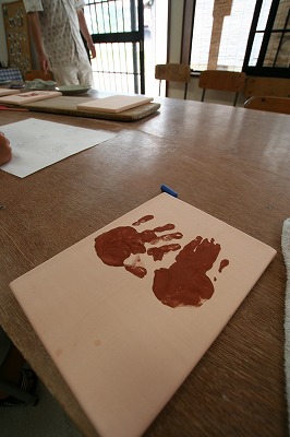 壁飾り用の焼き物にはお子さん達が手のひらに塗料を塗って手形をペタリ!!