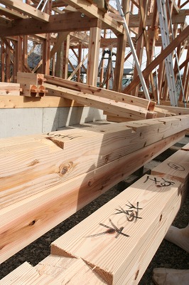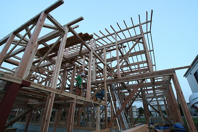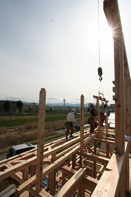 自然素材の家 上棟! 2009年4月24日 こんばんは、今日の会津はとてもいい天気で現場からは良く磐梯山が見えました! そして現場は上棟2日目をむかえました。 写真は車庫上の中2階部分です。 そして棟木を組んでいる様子。 小屋組みが建つと芯スミに糸をはり仕口が通っているか確認! そして親方のokの合図!! ヨシッ!! そして今日は2階の垂木までかけて無事に終了。 垂木も太いものを使うので我々も安心して上に上がって作業ができます。 何よりここは雪国会津、雪の重みに耐えてくれることでしょう。