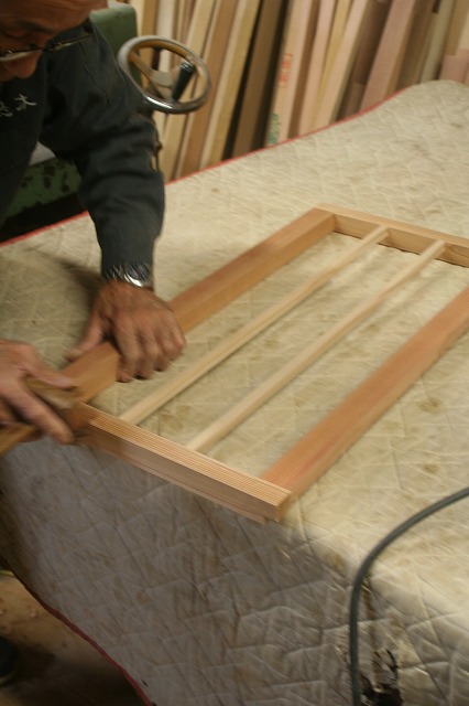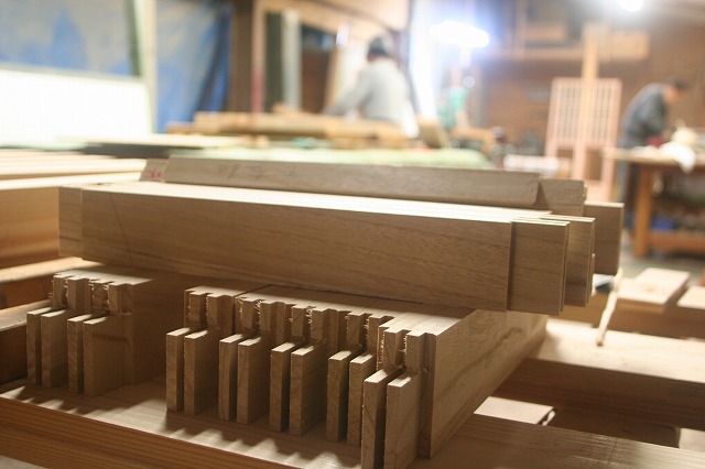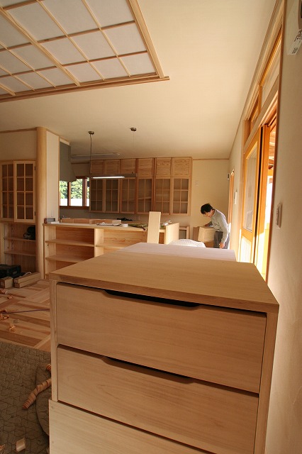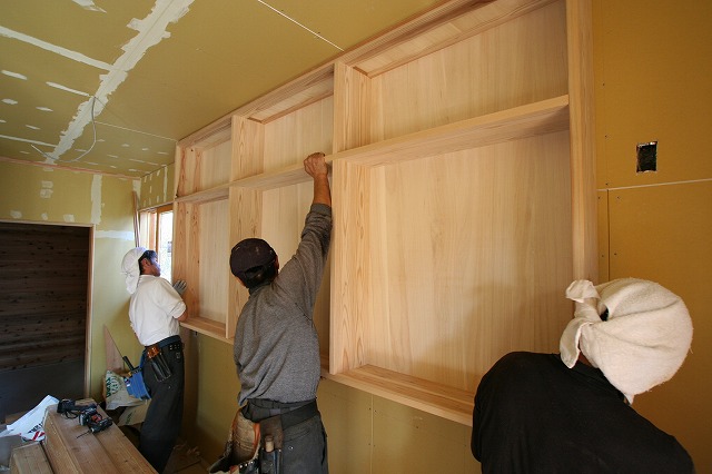 現場では自社製の建具と造作家具の取り付けが始まりました !!