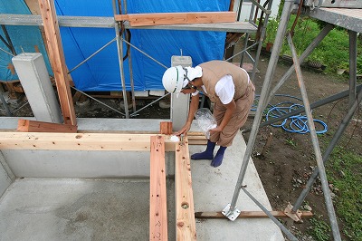 朝一で土台4ヶ所に現場作業者全員の安全を祈願してお清めの塩ではらいます(写真私です)