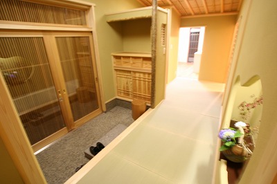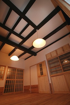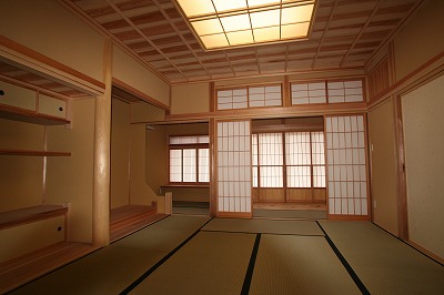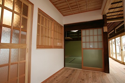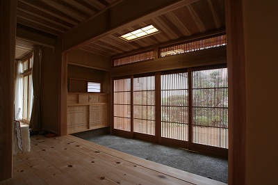 柱や差し鴨居は残して敷居は交換、壁の白い部分は全て漆喰塗り。